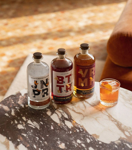 Conseils de dégustation : en cocktail, ou tout simplement JNPR n°1 allongé de tonic, BTTR n°1 & VRMH n°1 allongés d'eau pétillante.