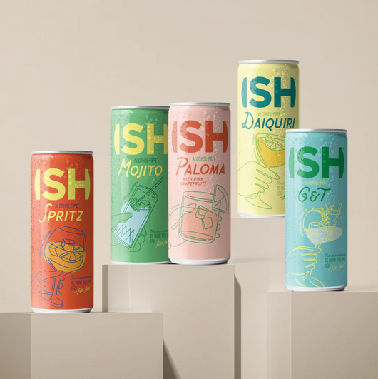 Cet ensemble de cinq boissons exquises sans alcool comprend le rafraîchissant Cocktail Daiquiri ISH 0,0 %, le revigorant Cocktail G&T ISH 0,5 %, le vibrant Cocktail Mojito ISH 0,5 %, le piquant Cocktail Paloma ISH 0,5 %, et le délicieux Cocktail Spritz ISH 0,5 %.